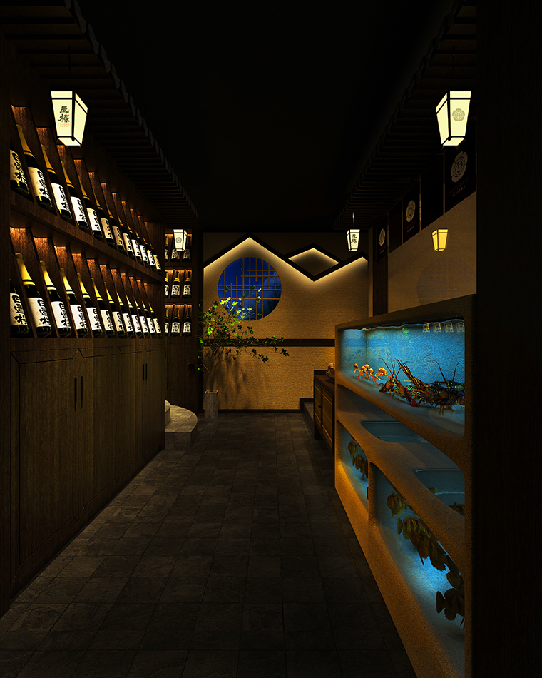 我們從門頭開始到天花吊頂、地面鋪設、墻面涂料、燈光、家具等各方面圍繞“京都味道、匠傳玉椿”來展開步移景異,一步一景的空間效果圖設計。